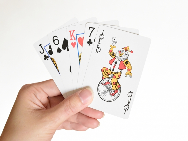 通常は使わないが、“ジョーカーズ・ワイルド”という変則ルールでは万能カードになる。どんな数字やスートにも化けられるため、役作りが一気に有利になる。