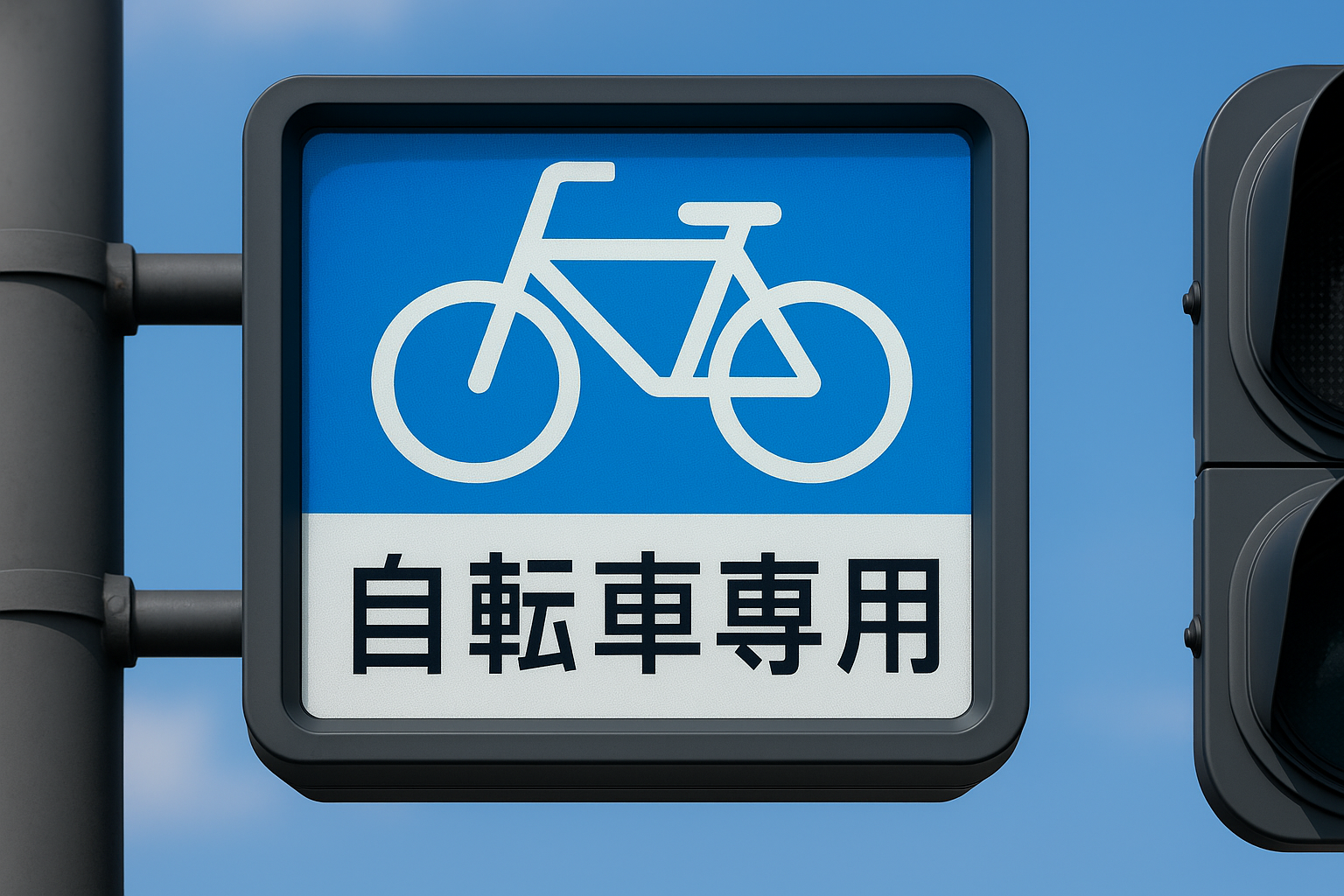 赤・青・黄の色灯は従来の信号と同じですが、その横に「自転車専用」と書かれた標識が設置されているのが特徴です。多くは歩行者信号の隣に設置され、自転車が通行するべきタイミングを示す役割を果たします。