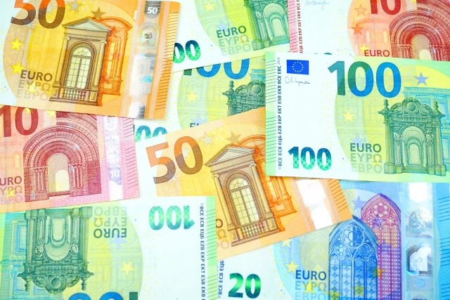 ユーロ:金・青・赤などカラフルな色調(紙幣ごとに色分け)